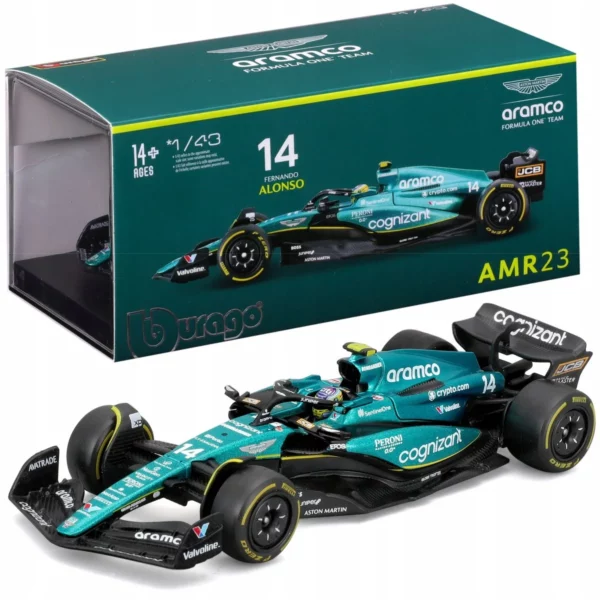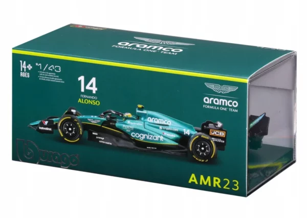 Celebrate Fernando Alonso’s remarkable 2023 Formula 1 season with this meticulously detailed 1:43 scale model of the Aston Martin AMR23, car number 14. This official Bburago die-cast replica captures the engineering precision and distinctive design of Aston Martin’s 2023 Formula 1 challenger, driven by the two-time World Champion.