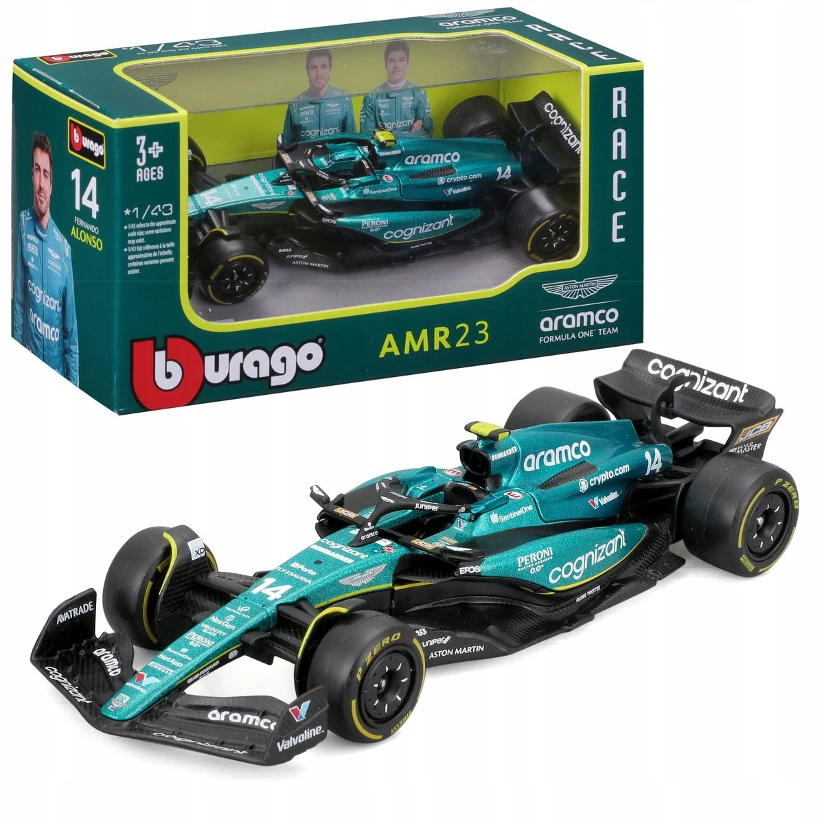 Detailed 1:43 scale model of Fernando Alonso’s Aston Martin AMR23 from the 2023 Formula 1 season — official Bburago die-cast replica with authentic Aston Martin livery, perfect for F1 collectors and fans.